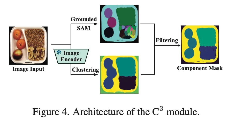 C3 모듈 구조는 위 Fig4에서 살펴볼 수 있습니다. 먼저, 입력 이미지가 들어오면 Recognizer Anything Model(RAM)을 사용해 image안에 있는 object들을 인식하게 되구요. 각 object에 대한 content tag를 생성해 내구요, 그 다음 Grounded SAM을 사용해 이들에 대한 mask를 생성하게 됩니다. Fig4에서는 위쪽 branch에 해당하겠네요. 이렇게 나온 mask는 M_{sam} ∈ R^{M \times H \times W이며, M이 검출된 component 수 입니다.