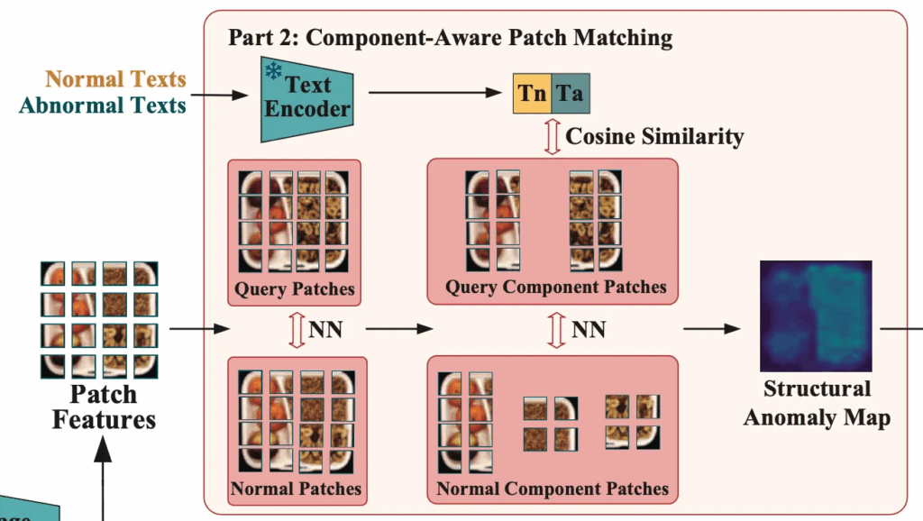 그 다음 우상단 부분에 있는 part2로 넘어가게 되는데요. 이 부분은 component-aware patch matching단계입니다. 먼저, normal과 anomalous 상태를 설명하는 text를 text encoder에 넣어 각각의 text feature를 추출한 다음 앞에 image encoder를 통해 뽑아낸 patch level의 feature를 가지고 structural anomaly map을 추출하게 됩니다. 추후에 자세하게 설명드리도록 하겠습니다.