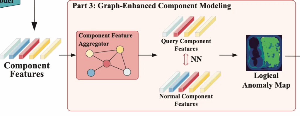 마지막으로는, Part3 단계인데요. 앞서 C3 모듈로 얻은 query image의 component feature F_{qc}와 정상 이미지의 component feature F_{nc}가 Graph-Enhanced Component Modeling(이하 GECM) 모듈로 들어가게 됩니다. 이 모듈은 component간 relation을 graph 형태로 모델링해서 뭐가 누락됐다던가, 더 추가됐다던가, 잘못 배치던 것과 같은 좀 더 semantic한 level의 anomaly detection을 수행하게 됩니다. 이를 통해 logical anomaly map이 나오게 되죠.