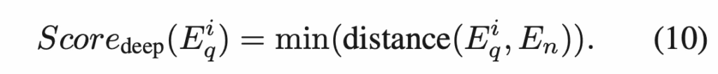 위 그림을 보시면 되는데요. 먼저 Query patch feature와 Normal patch feature가 있을 때, query image의 각 patch P_q^i와 normal patch 전체 P_n와의 cosine distance를 계산하고, 그 중 최소값을 anomaly score로 사용합니다.