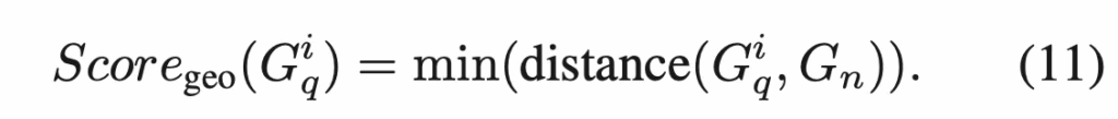 근데, logical anomaly는 feature 거리 뿐만이 아니라 area나 color, position과 같은 geometry 정보도 중요하기에 이에 대한 정보를 추출한 query와 normal geometric feature를 가지고 이 둘의 최소 거리를 계산하여 geometric anomaly score로 정의합니다.