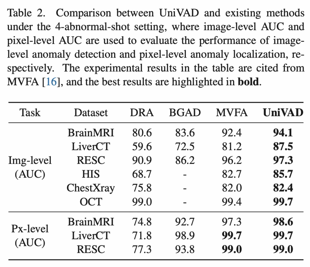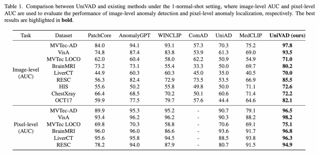 위 Table1에 결과가 나와있는데, 1-normal-shot에서의 실험 결과입니다. 보시면 맨 오른쪽에 있는 UniVAD는 image-level과 pixel-level 모두에서 기존 domain 특화된 방법론들의 성능을 모두 넘어 sota 성능을 달성한 것을 확인할 수 있습니다. 구체적으로 image-level AUC에서 평균 6.2%, pixel-level AUC에서 평균 1.7%의 성능 향상을 보이면서 단순 일부 데이터셋에 한정된 개선이 아니라 전반적으로 도메인 불문하고 일관된 성능 향상을 보여준다고 해석해볼 수 있습니다.