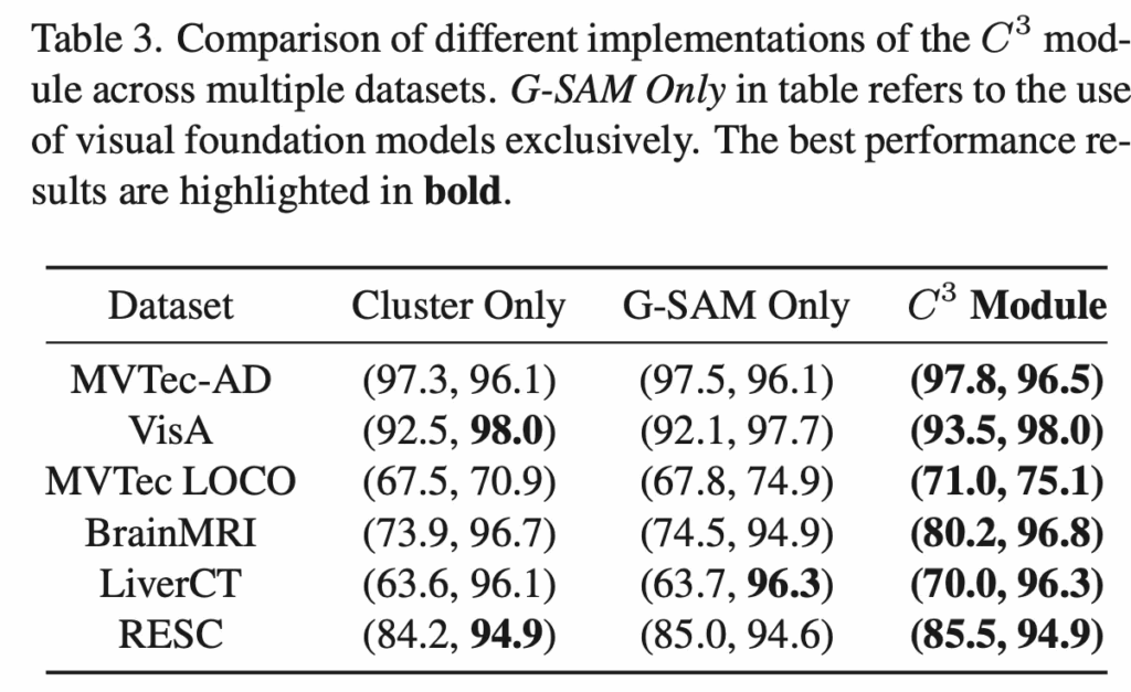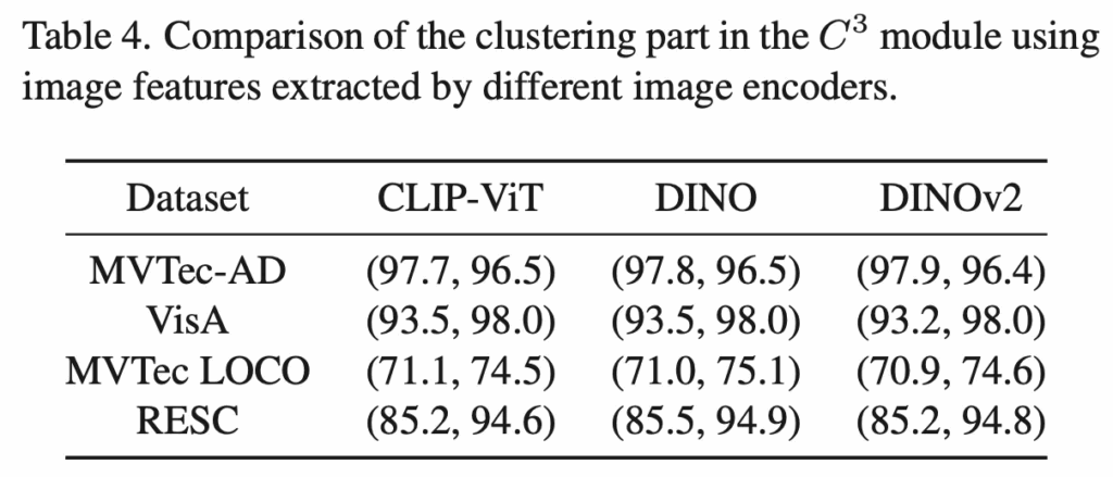 다음으로 ablation study 결과보도록 하겠습니다. 그 중 part1인 C3 모듈에 대한 검증 실험인데요. 이 C3 모듈은 기존 Grounded SAM만 사용했을 경우 너무 디테일하게 segmentation mask가 뽑이기 떄문에 normal과 query image mask를 일관성있게 비교하기 어려운 점을 해결하는 모듈이었죠. 위 Table3을 보시면 Cluster만 사용했을 경우와 Grounded SAM만 사용했을 경우, 그리고 이 둘을 함께 사용한 C3 모듈의 결과를 보이고 있습니다. 결과적으로 이 둘을 함께 사용한 C3 모듈이 모든 데이터셋에서 가장 좋은 성능을 보이며 C3 모듈의 효과를 입증하고 있습니다.