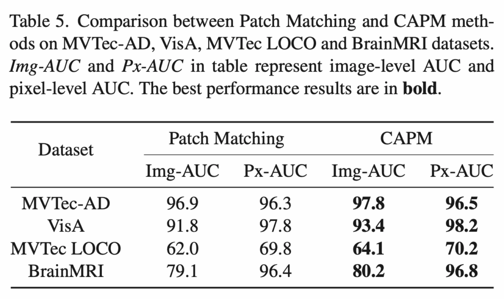 다음은 Part2인 component-aware patch matching에 대한 검증 실험 결과입니다. 기존 patch feature matching 방식은 이미지 전체에서 patch를 추출한 다음 모든 patch끼리 matching을 하게 되는데, 이럴 경우 배경 영역이나 전혀 상관없는 부분의 patch가 비슷한 색이나 texture를 가졌을 때 잘못 매칭되는 경우가 생기게 됩니다. 이 때문에 탐지 성능이 떨어지게 되죠. 반면에 CAPM 모듈은 이런 한계를 보완하고자 C3 모듈에서 얻은 component mask를 기반으로 matching 영역에 제한을 두는 방식이었습니다. Table5를 보시면, 원래 patch matching 방식과 CAPM을 여러 데이터셋에서 비교한 결과 모든 데이터셋에서 structural anomaly를 훨씬 잘 잡아내는 모습을 보입니다.