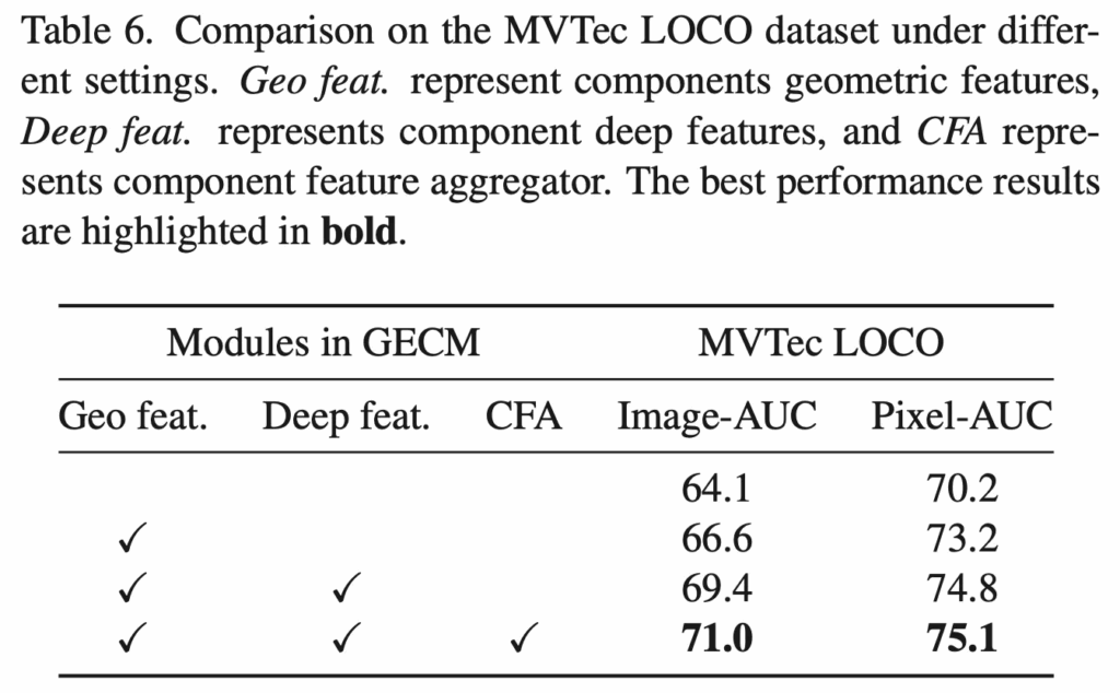 이에 대한 결과를 table6에서 보시면 단순 part2인 CAPM만 썼을 때가 맨 위에 아무 체크 표시 안되어 있는 행에 해당하겠구요. 그 아래에 Gemoetric feature만 썼을 경우 추가로 deep feature를 쓸 경우, component feature aggregation을 함께 할 경우가 있습니다. 보시면 하나씩 더 사용할 경우에 성능이 점진적으로 향상된 것을 보아 GECM이 logical anomaly detection에서 좋은 효과가 있다고 해석해볼 수 있습니다.