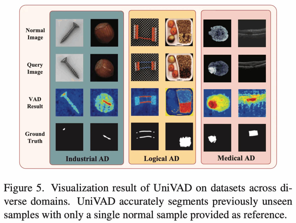 마지막으로 시각화 결과를 보고 마무리하겠습니다. FIg5 예시는 industrial, logical, medical anomaly detection 세 도메인에서 가져온건데, 여기서는 단 하나의 normal sample만 참고하도록 하였습니다. 보시면 본 논문에서 제안된 UniVAD는 이전에 한 번도 본 적 없는 새로운 object의 anomaly를 정확하게 탐지하고 있습니다. 이는 다른 학습이 필요하거나, 하나의 domain, 하나의 object에서만 잘 동작하는 다른 모델들과 비교했을 때 좀 더 application 측면에 잘 맞는 모델이라고 볼 수 있겠네요.