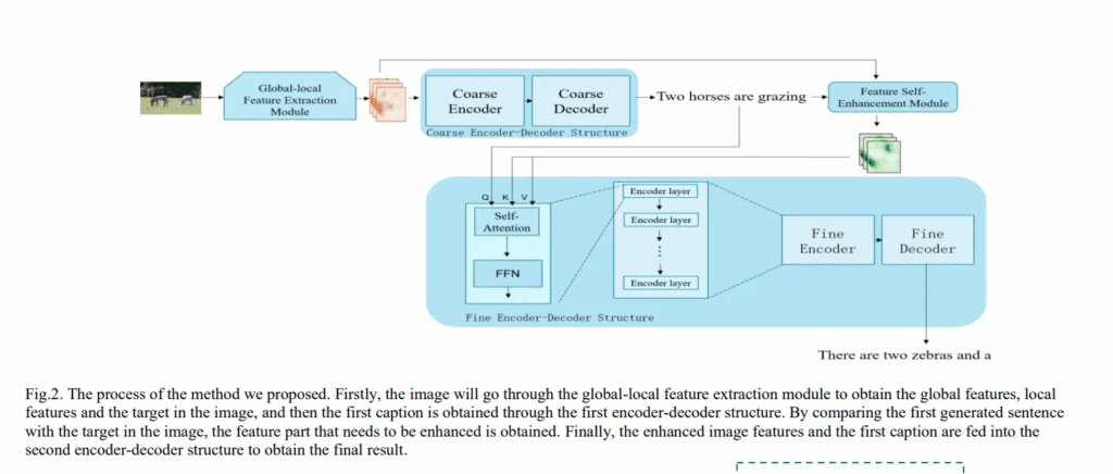 저자의 이 방법론은 단일 Encoder-Decoder 구조 대신, Dual Encoder-Decoder 구조를 사용합니다. 첫번째 Encoder-Decoder가 이미지를 보고 coarse 한 캡션을 생성합니다. 그 다음 첫번째 문장과 이미지의 특성을 비교하여 어떤 객체나 속성이 빠졌는지 확인하고 누락된 부분을 보강하기 위한 Feature Self-Enhancement 모듈이 도입됩니다. 이 모듈은 첫 캡션에서 언급되지 않거나 누락된 객체 영역을 다시 인코딩하여 두번째 Encoder-Decoder 구조에 반영합니다. 두번째 Encoder-Decoder 구조는 이를 바탕으로 더욱 정교하고 fine 한 캡션을 생성합니다.