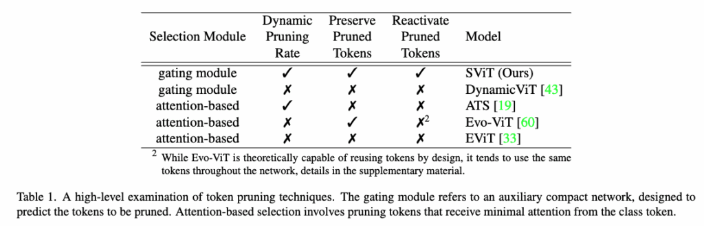 selection Module에 해당하는 것이 4번이고 나머지는 이름에 맞게 연결지어서 보시면 좋을 것 같은데 앞서 언급한 4가지 요소를 다 적용을 시킨 것이 SViT입니다. 물론 이 표는 토큰 프루닝 기법들을 개략적으로 비교한 것이어서 구현 세부사항이 아니라 설계 방식이나 앞서 언급한 4가지 주요 특징을 비교하는 개요 표라고 보시면 좋을 것 같습니다.