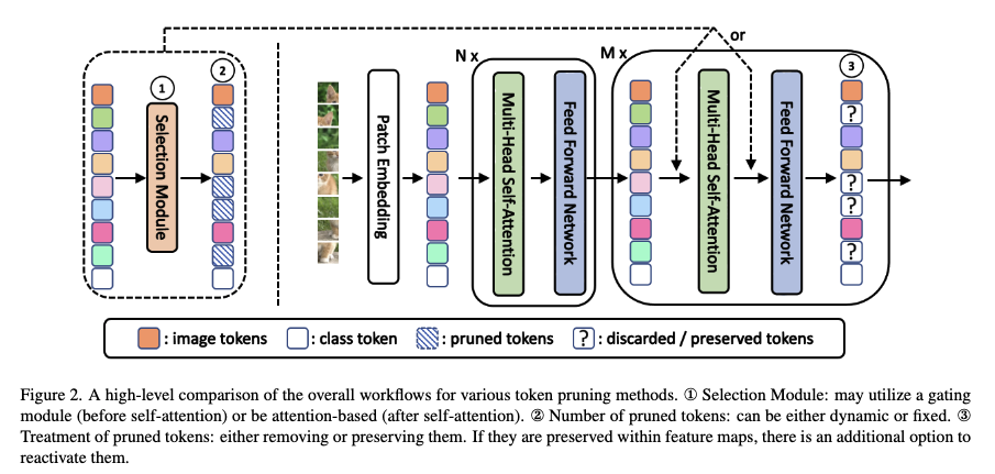 실제로 기존 연구들은 게이팅 네트워크(이 토큰을 계속 쓸지 버릴지 결정하는 작은 네트워크)를 두어 토큰의 중요도를 학습하거나 클래스 토큰으로부터 어텐션 값이 작은 토큰을 제거하는 방법을 시도해왔습니다. 하지만 이런 방법들은 대부분 이미지 분류에만 국한되어 있었고 Object Detection이나 Instance Segmentation 같은 dense task에는 적용된 사례는 여전히 드물다고 합니다.