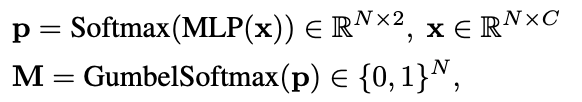 실제 구현은 각 레이어 앞에서 selection module(2-layer MLP + Gumbel-Softmax)이 토큰 마스크 M\in{0,1}^N 를 냅니다.