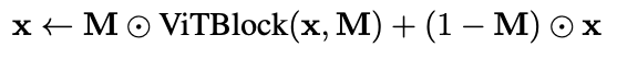 M \odot \text{ViTBlock}(x, M) 같은 경우에는 활성 토큰만 업데이트 한다라고 보시면 될 것 같고 \odot x 같은 경우는 프루닝된 토큰은 원래 값을 유지하도록 한다고 보시면 될 것 같습니다. (토큰별로 ViTBlock 결과를 적용할지 말지 선택하는 역할)