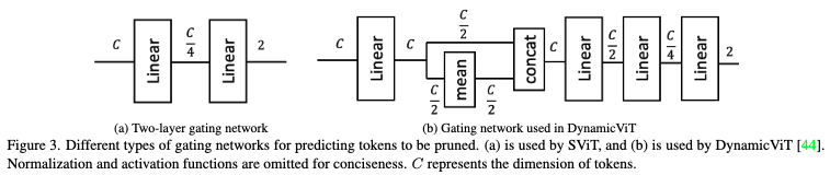 먼저 기존 토큰 프루닝 연구들은 대체로 복잡한 게이팅 네트워크를 사용하여 프루닝할 토큰을 예측했습니다.