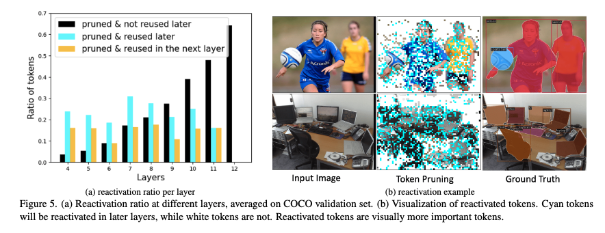 해당 분석은 초기에 버린 토큰을 너무 일찍 영구 제거하면 해롭다는 것이고, 모델이 스스로 다시 필요한 토큰을 되살리면서 손실을 줄이고자 하는 것으로 보실 수 있습니다. 이미지 내 시각화(b)를 보면 단순 배경은 재활성화 거의 없고반대로 사람, 축구, 컴퓨터 등 관심 객체 영역은 선택적으로 재활성화되는 걸 확인할 수 있습니다.