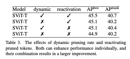 보존된 토큰을 재사용하는 경우 사용하지 않았을 때보다 성능이 향상되는 것을 확인 할 수가 있었고 이 또한 결과적으로 동적 비율만 적용을 해도 Box/Mask AP가 0.2 정도 향상되는 것을 확인 할 수 이가 있습니다. 결과적으로 두개를 동시에 적용하면 성능 향상폭이 더 커지는 것을 확인하실 수 있습니다.