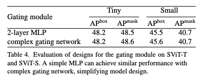 게이팅 네트워크를 복잡하게 만들지 않고, 단순한 2-Layer MLP만 써도 충분히 잘 작동한다는 것도 확인할 수 있는 테이블 표입니다. 자세하게 보면 Tiny 모델에서는 Box AP는 동일, Mask AP는 -0.1 정도 하락하였고 Small 모델에서는 Box -0.1, Mask는 동일한 것으로 보이는데 사실상 성능 차이가 거의 없는 것을 보실 수 있습니다.