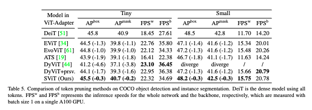 Dense 모델(DeiT) 대비 성능을 비교했을 때, 기존 모델(DynamicViT, EViT, EvoViT, ATS)은 Dense 대비 박스 AP -1.3 ~ -1.8, 마스크 AP -1.2 ~ -1.7 정도 손실이 있었습니다. 반면 SViT-S는 박스/마스크 둘 다 -0.2 ~ -0.3으로 성능 하락 폭이 가장 적은 것을 보실 수 있습니다.