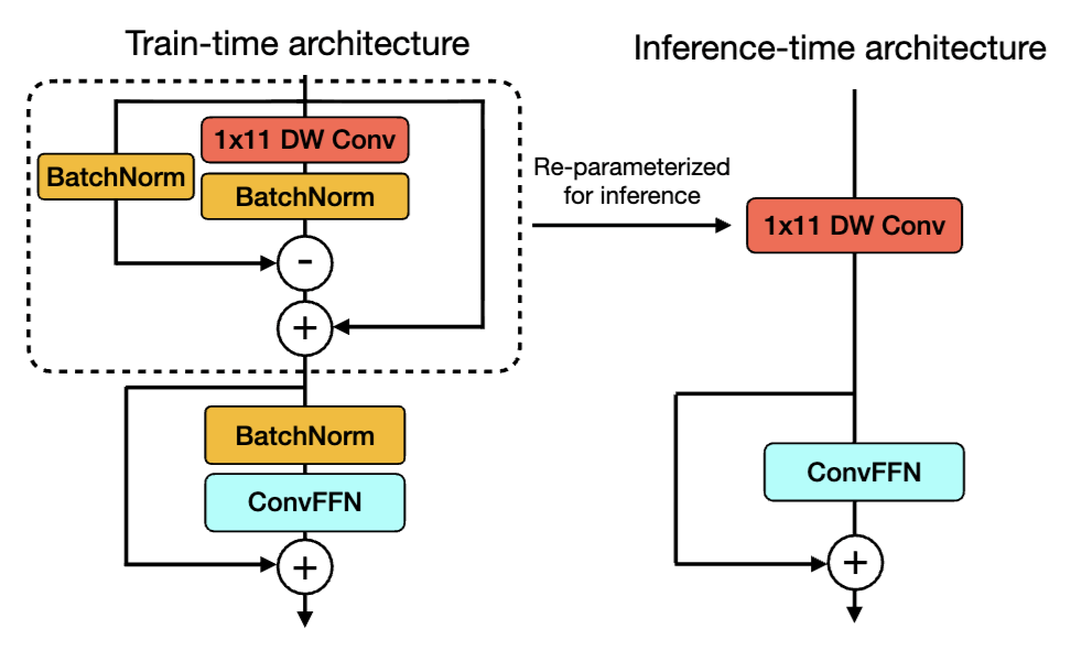 즉, 학습 단계에서 Skip Connection과 BN을 통해 학습 안정성과 표현력을 확보하고, 추론 단계에서는 이 구조를 수식적으로 병합하여 동일한 파라미터로 동작하게 하기 때문에 실제로 성능 저하는 거의 발생하지 않고, MobileCLIP 논문에서 이미 이를 실험적으로 증명했다고 하네요.