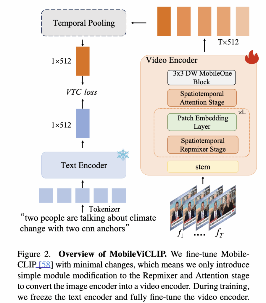 더 나아가 Spatiotemporal RepMixer와 Attention 모듈을 추가하여 시간 정보를 처리할 수 있도록 확장했는데, 이건 MobileCLIP의 경량성과 효율성은 그대로 가져가면서 비디오 이해 능력을 강화한 구조라고 할 수 있겠네요!