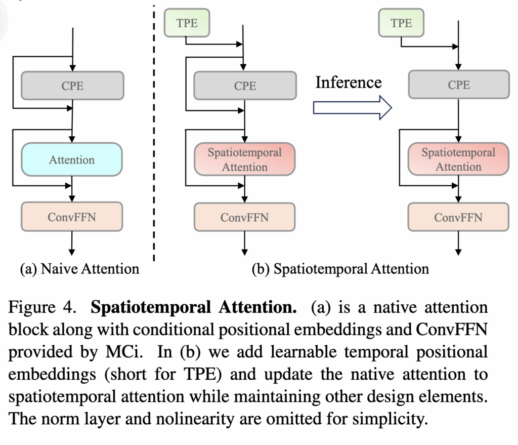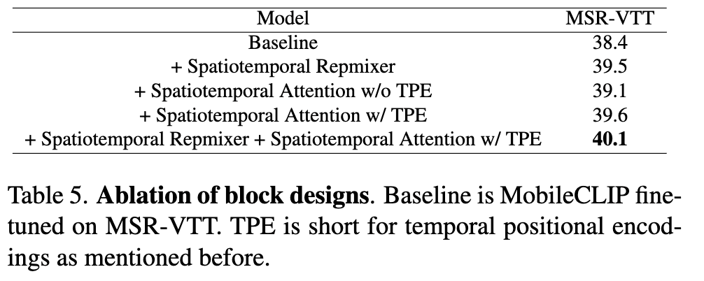 뿐만아니라, 기존 MobileCLIP의 Attention 블록을 확장해 공간-시간적 관계를 함께 모델링할 수 있도록 설계하였다고 합니다. 상단 그림4(b)에서 확인할 수 있듯, Conditional Positional Encoding(CPE) 구조에 Temporal Positional Encoding(TPE)을 추가하여 프레임 간 순서와 위치 정보를 학습할 수 있게 한 것이 핵심입니다.