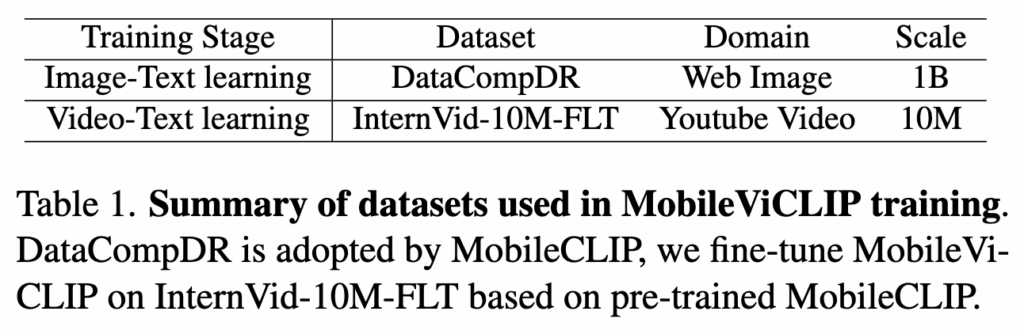 MobileViCLIP의 백본인 MobileCLIP은 DataCompDR-1B라는 강화 데이터셋으로 사전학습되었습니다. 여기에 더 나아가 MobileViCLIP의 학습에는 InternVid-10M-FLT를 사용하였습니다. 비디오에 대한 이해를 위해 비디오 텍스트 데이터셋으로 학습을 수행한 것이죠.