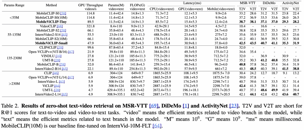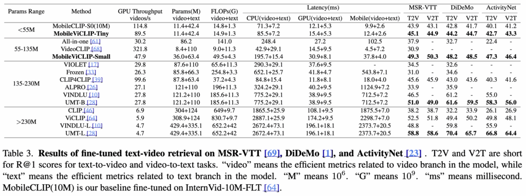 Fine-tunin에서도 MobileViCLIP은 R@1 성능이 크게 향상한 것을 알 수 있었습니다.