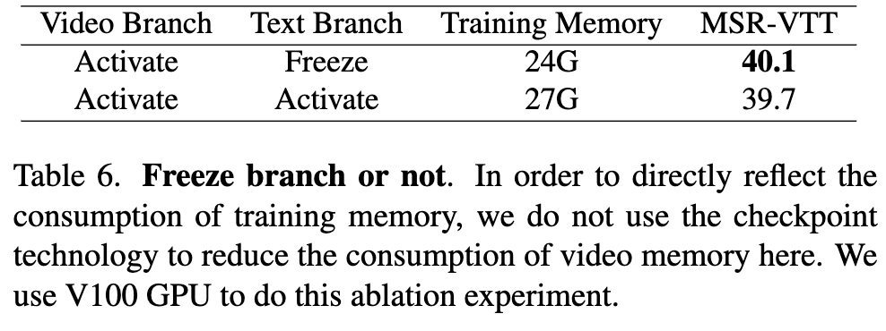 다음으로 텍스트 인코더를 학습 시 함께 업데이트할지 여부를 확인한 결과, 텍스트 브랜치를 freeeze 하지 않아도 성능에는 큰 차이가 없었고 학습 시간만 늘어났다고 합니다. 따라서 최종 버전에서는 텍스트 브랜치를 freeze 하여 효율성을 높였다고 하네요.