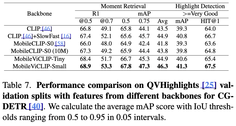 먼저, Video Temporal Grounding (QVHighlights)에서 MobileViCLIP-Small은 CLIP + SlowFast 조합보다도 더 좋은 성능을 보이며, 시간 단위로 영상을 이해하고 특정 구간을 정확히 찾아내는 데 더 강함을 확인할 수 있습니다.