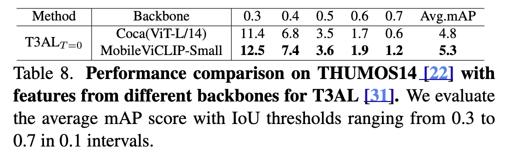 아래 Table 7, 8, 9에서는 MobileViCLIP의 다른 비디오 태스크에서의 일반화 성능 결과입니다. 결론부터 말씀드리면, Temporal Grounding, Action Detection, Video Captioning 등 다양한 비디오 다운스트림 태스크에서 대형 모델을 상위하는 성능을 보이며 강력한 일반화 능력을 입증하였다는 실험 결과입니다.