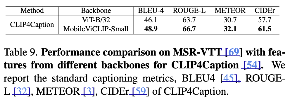 뿐만 아니라 비디오 캡셔닝에서도 MobileViCLIP-Small은 ViT-B/32 기반 모델보다 더 나은 캡션 생성 성능을 보이기도 했습니다.