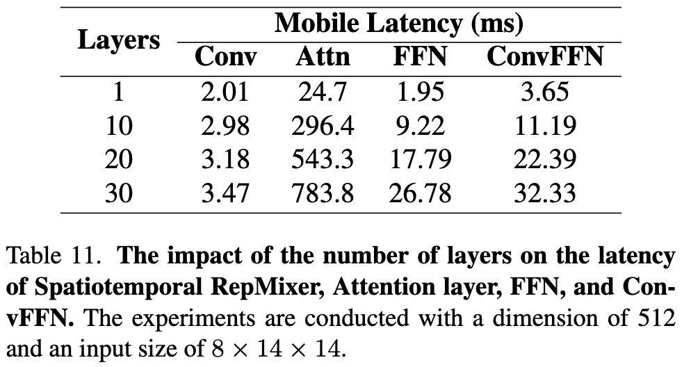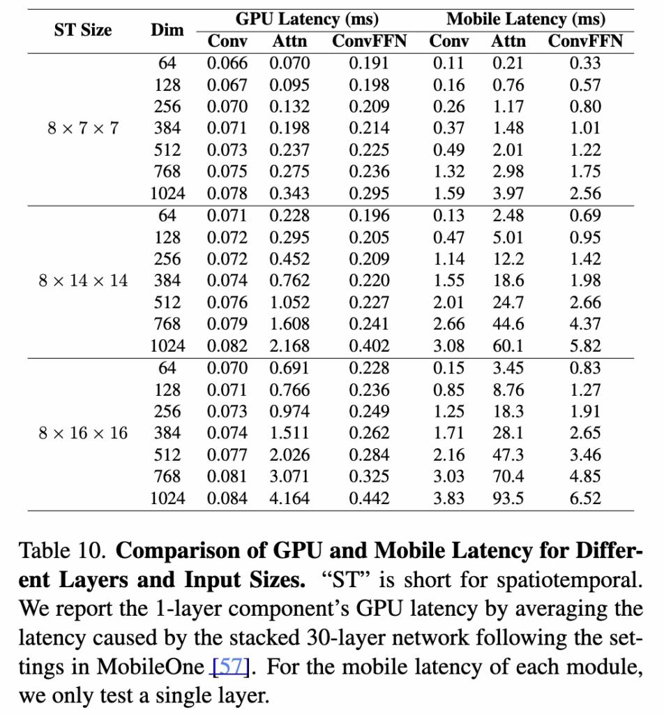 저자가 제안하는 Spatiotemporal RepMixer(Conv), Attention(Attn), FFN, ConvFFN 모듈의 latency를 GPU와 모바일 환경에서 각각 측정한 결과입니다.