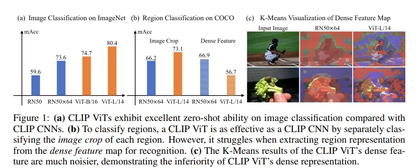 표의 순서상 image classification 성능이 RN 보다 ViT가 더 좋은데 Region classification 으로 넘어가면 Dense Feature의 성능이 RN 이 더 높고, Image crop 으로 던져줬을때의 ViT 성능은 여전히 ViT가 더 높으므로, 이 성능을 이용하면 어떨까 하는 내용을 보여주고 있습니다. Figure 1 의 (c) 를 보면 Dense Feature map을 각각 K-mean 으로 묶어서 시각화 하였을때 ResNet이 ViT보다 확실히 배경이나 객체에 대한 segmentation 구분력이 존재하는 것을 확인할 수 있습니다.