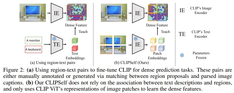 CLIPSELF는 text 없이 self-distill만으로 dense alignment를 강화하는 것으로 이해했습니다.