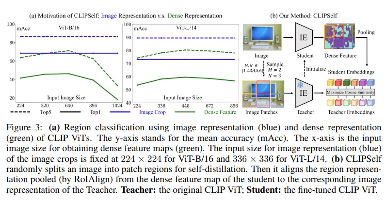(b) 설명을 읽으면 알 수 있듯이 저자의 방법론은 regions와 text descriptions 와의 관계에 의존하지 않는다고 적혀있습니다. 각 region 패치에 맞는 text가 존재하지 않더라도 ViT의 representations 만으로도 dense feature로 하여금 배우게 할 수 있다고 합니다.