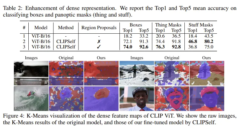 Figure4는 Dense feature map 에 K-means clustering을 통해 pixel embedding을 시각화한 것입니다. CLIPSELF 로 파인튜닝 된 모델은 동일 객체 pixel 의 정보들을 더 잘 묶는 모습을 확인할 수 있습니다. 시각적으로 CLIP ViT dense representation이 개선됐음을 확인할 수 있습니다.