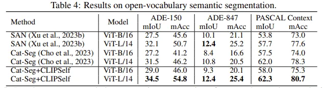semantic segmentation 에서는 cat-seg 라는 방법론에 저자의 CLIPSELF 를 붙였습니다. 전체적으로 데이터셋에 상관없이 모두 성능이 향상되는 모습을 보입니다. 여기서 mIoU 와 mAcc는 얼핏보면 비슷해보일 수 있지만 iou 는 FP 를 고려하지만 acc는 fp 를 고려하지 않는 값입니다.