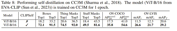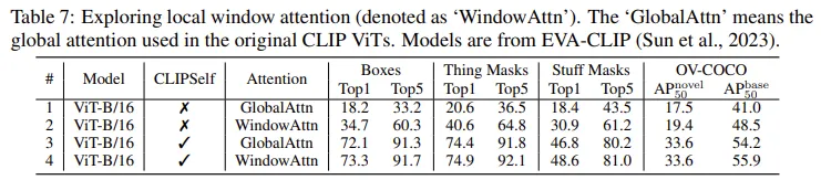 Table 7 은 teacher의 마지막 Attention 방식을 global로 할지 window 방식으로 지역적 패치위주의 attention을 할지를 ablation 한 결과입니다. 저자의 CLIPSELF 방법론을 사용하는 것이 훨씬 큰 성능향상을 보여주고 있습니다.