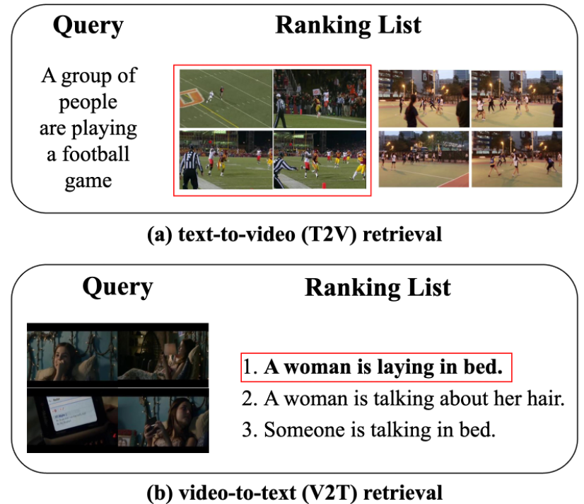 Text-Video Retrieval(TVR) 태스크는 주어진 쿼리에 대응하는 비디오나 텍스트를 검색하는 태스크입니다. 예를 들어, 텍스트 쿼리가 입력되면 해당하는 비디오를 찾고, 반대로 비디오 쿼리가 입력되면 이에 대응하는 텍스트를 검색하는 방식입니다.