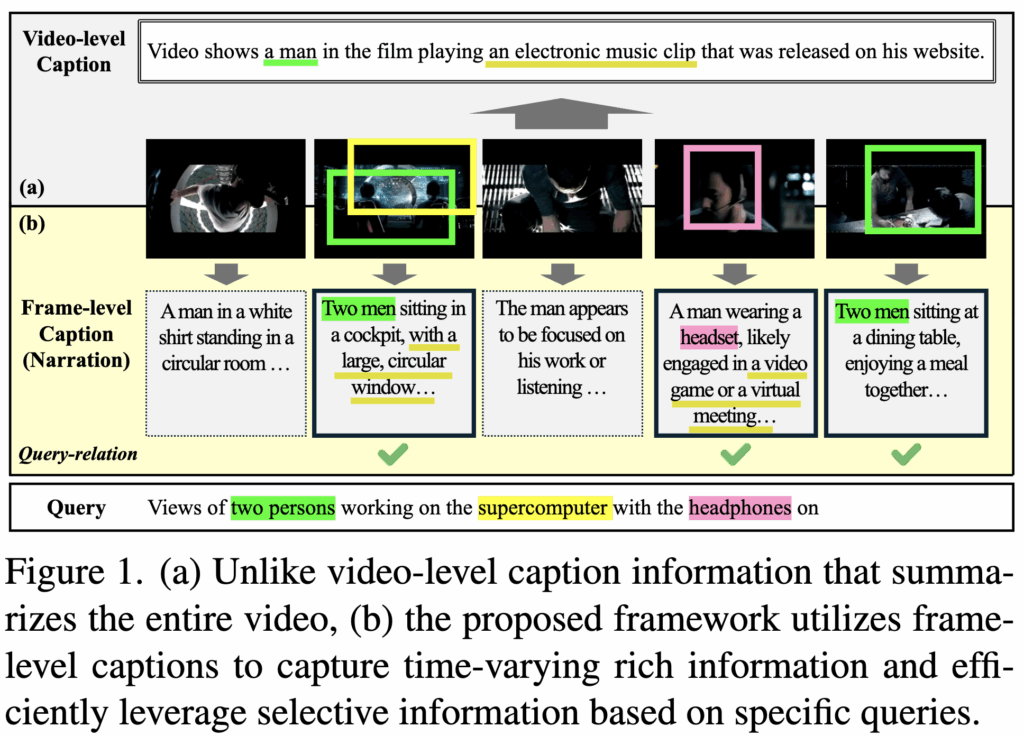 EA-VTR 은 이 문제를 보완하기 위해 frame-level caption 을 도입해, 비디오에서 시간에 따라 변하는 사건(event)을 인식하는 event-aware 방식을 제안했습니다. 하지만 이들은 주로 event detection 성능을 높이는 것에 초점을 맞췄고, retrieval 태스크에서 중요한 쿼리에 따라 필요한 캡션만 활용하는 방법은 고려하지 않았습니다.