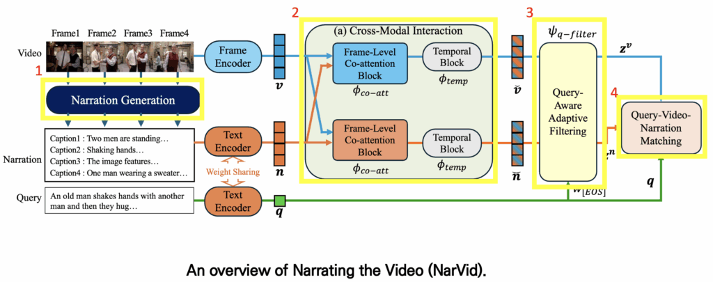 이러한 기존 방식들의 한계를 극복하기 위해, 저자는 NarVid(Narrating the Video) 이라는 새로운 프레임워크를 제안합니다. NarVid도 EA-VTR과 마찬가지로 비디오 전체에서 frame-level captions 을 생성합니다. 하지만 이렇게 생성한 모든 캡션이 쿼리와 직접적으로 관련 있는 것은 아니기 때문에, 불필요한 캡션을 적절히 걸러내고 필요한 정보만 활용하는 처리 과정을 추가해줬습니다. 뿐만 아니라 생성된 캡션을 다양한 방식으로 활용을 해줬는데 자세한 방법론은 이후 Method 부분에서 알아보도록 하겠습니다.