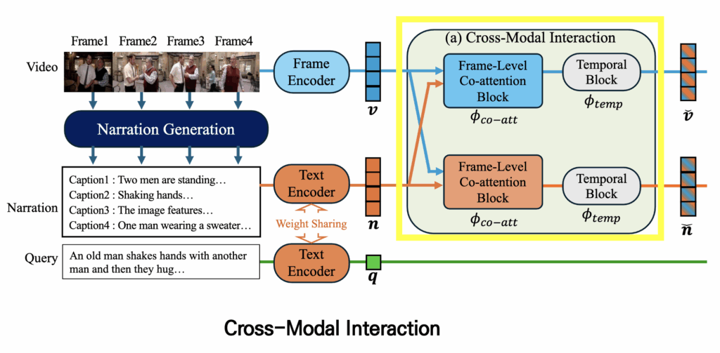 이제 encoder를 통해 얻은 frame features와 caption features를 이용해 바로 alignment를 맞출 수도 있지만, 단순히 그대로 사용하는 것보다는 두 모달리티의 특징을 상호작용시키는 모듈을 추가하여 feature를 향상시키는 것이 alignment를 맞춰주는 것에 도움을 줄 수 있습니다. 이를 위해 저자는 Cross-Modal Interaction 모듈을 사용합니다.