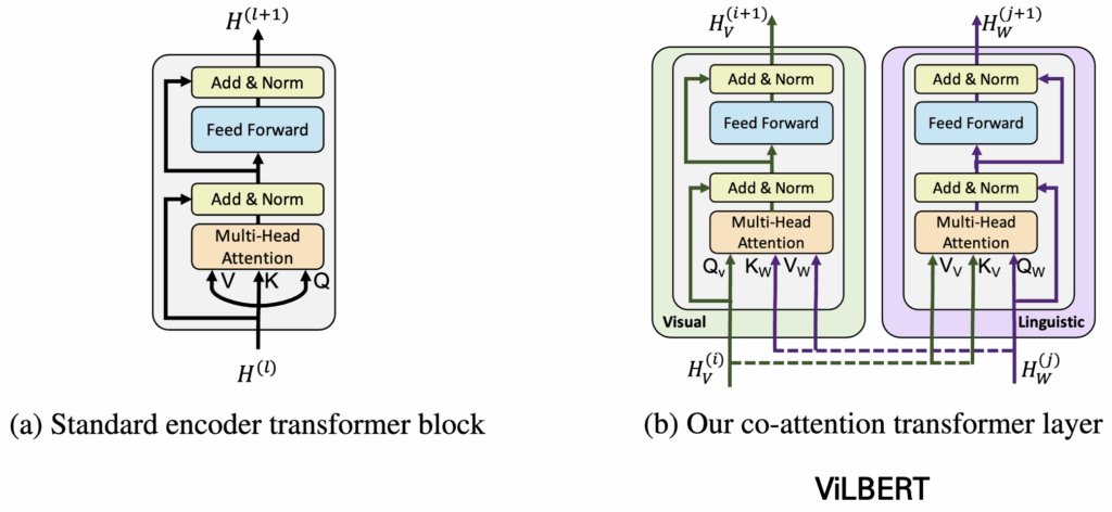 일반적인 Attention 연산에서는 Query, Key, Value 모두 같은 입력에서 가져와 연산을 수행합니다. 하지만 ViLBERT에서 제안한 Co-Attention(co-att)은 한 모달리티에서 처리하는게 아닌 다른 모달리티의 피처를 참고하여 Attention 연산을 수행합니다. 예를 들어, visual feature를 처리한다고 가정하면 Query는 visual feature 자체를 사용하고, Key와 Value는 text feature에서 가져옵니다. 이 과정을 통해 visual feature는 텍스트 정보를 반영하게 되며, 반대로 text feature도 visual 정보를 반영할 수 있습니다. 결과적으로 서로 다른 모달 간의 정보를 결합하여 상호 보완적이고 향상된(feature-enhanced) representation을 얻을 수 있습니다.