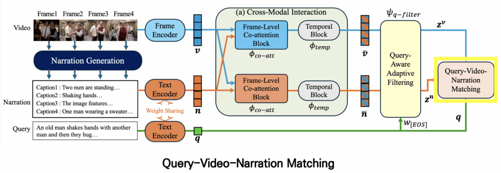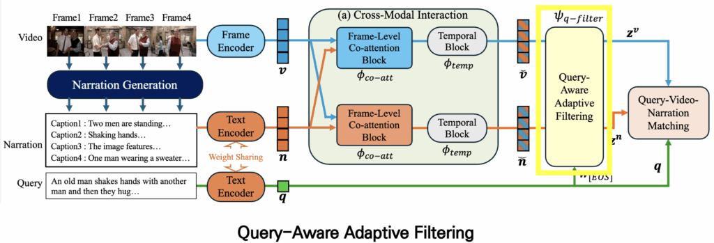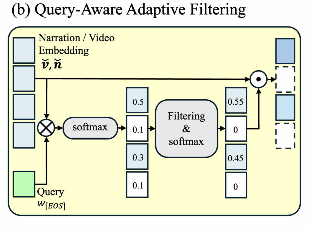 그리고 이렇게 생성된 강화된 feature를 가지고 바로 쿼리와 매칭을 수행할 수도 있지만, 실제로 프레임과 캡션에는 쿼리와 관련 없는 불필요한 정보가 포함될 수 있습니다. 이를 해결하기 위해 저자는 쿼리를 기반으로 한 filtering module을 추가하여 중요하지 않은 정보를 제거합니다.