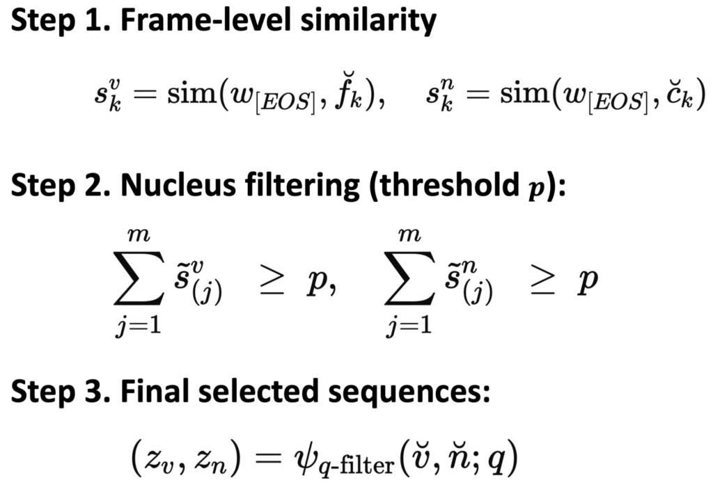 구체적으로, 쿼리 feature q, 비디오 feature v, 캡션 feature n 이 있다고 가정하면, 필터링 과정은 다음과 같이 진행됩니다.