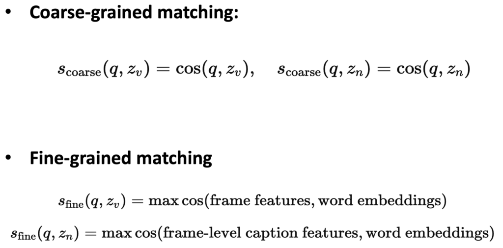- 다음으로 쿼리의 각 단어(word embedding)와 프레임의 [CLS] 토큰 간 유사도를 계산하여, fine-grained 매칭을 수행합니다.