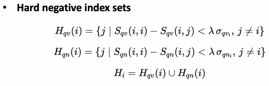 저자는 Contrastive Loss뿐만 아니라 Hard Negative Loss도 함께 사용합니다. Hard Negative 샘플이란, 모델이 구분하기 어려운 Negative 샘플을 의미합니다. Hard Negative 샘플을 구하는 과정은 다음과 같습니다.