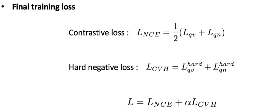 최종 Loss는 다음과 같이 Contrastive Loss와 Hard Negative Loss로 구성하였습니다.