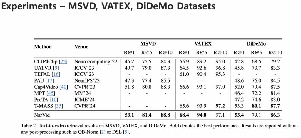 MSR-VTT, MSVD, VATEX, DiDeMo 데이터셋에서의 성능은 다음과 같습니다.