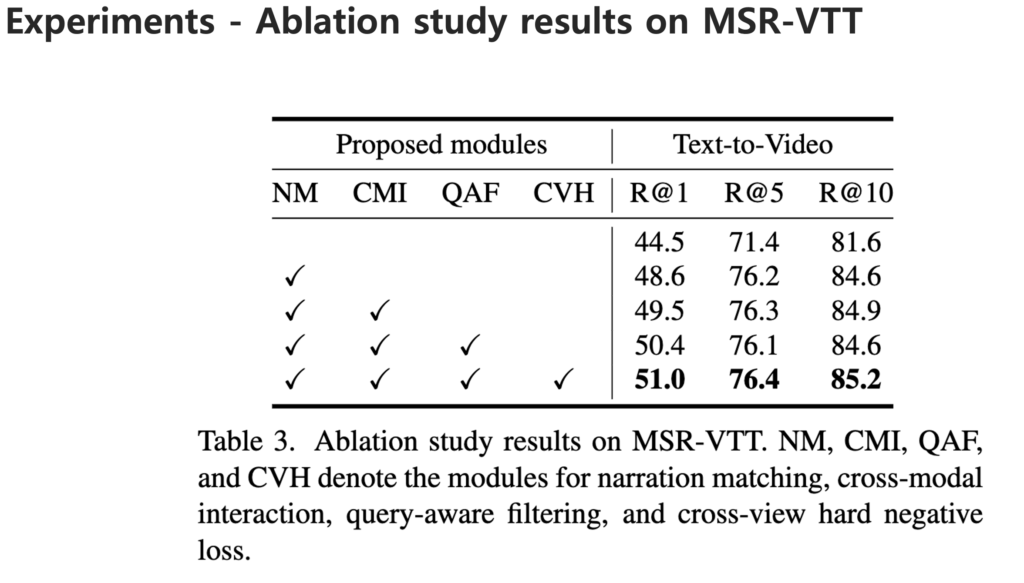 저자는 제안하는 네 가지 모듈을 검증하기 위해 MSR-VTT 데이터셋에서 Ablation Study를 수행했습니다. 먼저, Narration Matching(NM)모듈을 추가했을 때 R@1 성능이 4.1% 향상되며 내레이션이 매칭 과정에서 보조적인 역할을 한다는 점을 확인했습니다.