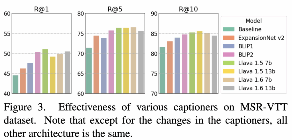 마지막으로, 내레이션 생성 모델의 차이가 성능에 어떤 영향을 미치는지도 분석했습니다. 생성 모델로는 Image-Captioning 모델, VLP(vision-language pre-trained) 모델, 그리고 LMM(Large Multimodal Models)을 활용했을 때 모두 성능 향상이 나타났습니다. 다만, 성능이 더 좋은 모델일수록 더 디테일하고 긴 캡션을 생성했는데, 이 과정에서 쿼리와 무관한 단어들이 포함되면 오히려 검색 성능에 부정적인 영향을 줄 수 있다고 저자는 설명하고 있습니다.