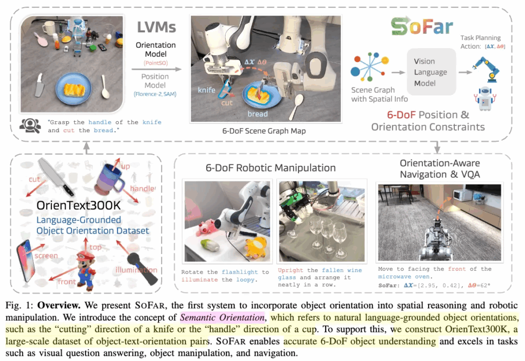 첫째, PointSO를 도입. PointSO는 오픈월드 환경에서 새로운 객체의 semantic direction을 추론하는 orientation base model로써 작용. 둘째, OrienText300K을 학습 데이터셋 구축. semantic directions로 annotation된 대규모 3D 모델 데이터셋으로, orientation 모델인 PointSO 학습에 기여. 셋째, 강력한 VLM에 향상된 공간 이해를 결합한 통합 시스템인 SoFAR를 개발하여 위치 정보와 orientation이 모두 필요한 복잡한 로봇 조작도 가능하게 함. 넷째, 6-DoF SpatialBench 및 Open6DOR V2 제안. orientation-aware한 spatial VQA 벤치마크와, open-loop 및 closed-loop 방식의 open-world 6D rearrangement 전략을 평가하기 위한 포괄적인 로봇 조작 벤치마크.